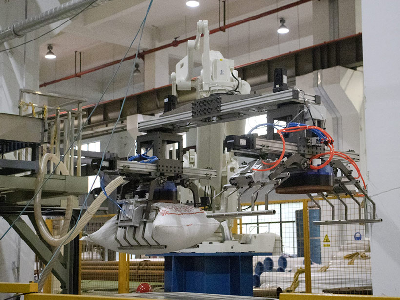 道金研發的“軟包物料智能拆垛-機器人裝車系統”,是一種適用于糧油廠、面粉廠、化肥廠等軟包袋裝物料發貨裝車環節的全自動智能裝車系統,它可以替代人工裝車、降低勞動強度、縮短裝車碼垛時間、減少貨品損傷、降低裝車成本和提高工作效率,從而實現軟包袋裝物料裝車過程的自動化。