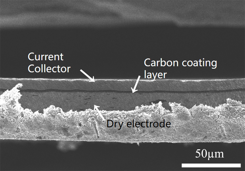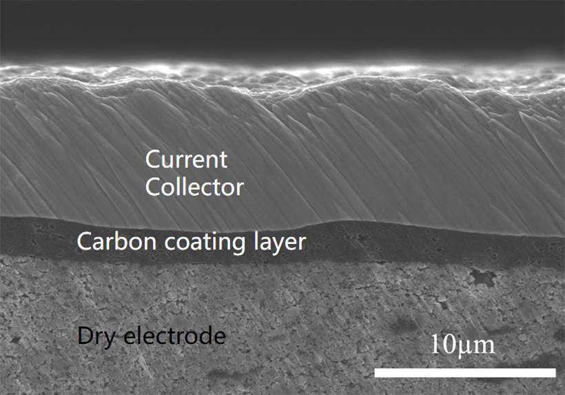 該方法可以提升干法電極與集流體的結合力和導電性,從而降低了電極內阻,并且在高循環狀態下仍然能與集流體緊密結合。該方法工藝簡單,成本低廉但是對電池電極性能的提升至關重要,其結合力高于同類產品2-3倍。